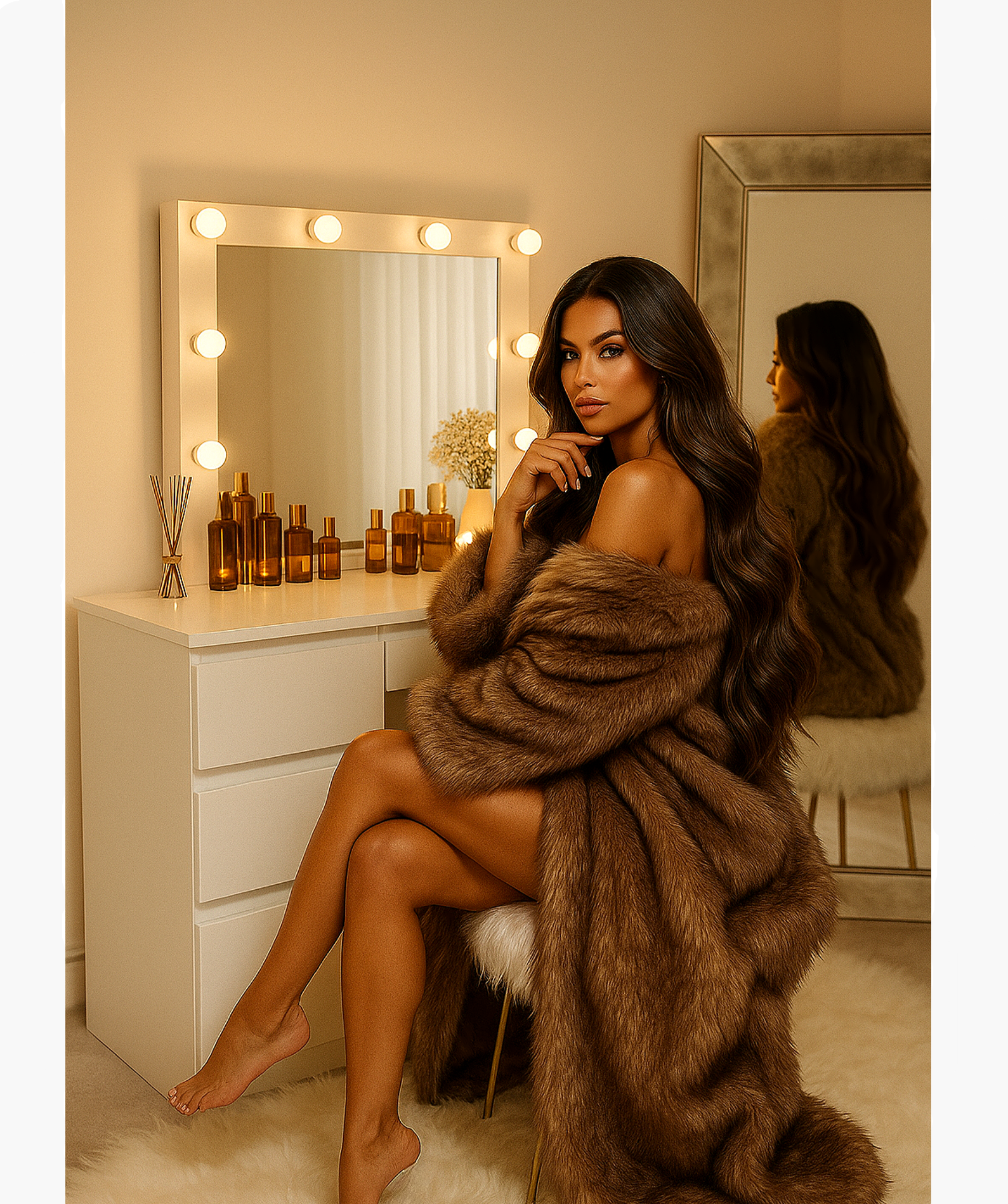 Des fourrures élégantes, des vanity raffinés et des miroirs lumineux pour révéler ton glow unique.